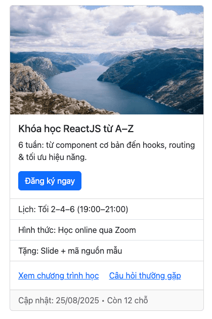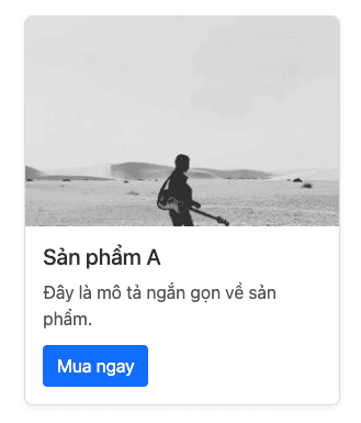 Bootstrap giải quyết điều này bằng component Card: chỉ với vài class sẵn có, bạn đã có ngay một card đẹp mắt, thống nhất với toàn bộ hệ thống thiết kế. Để thấy rõ sự khác biệt, hãy cùng so sánh cách tạo ra một card hiển thị ảnh + tiêu đề + mô tả + nút bằng hai phương pháp: