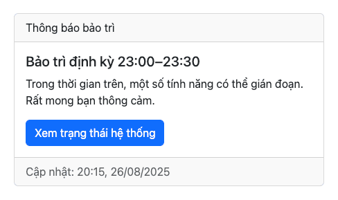 Một ứng dụng hay website hiện đại thường có khu vực thông báo (maintenance, sự cố dịch vụ, cập nhật mới…). Card là lựa chọn phù hợp nhờ khả năng hiển thị nội dung ngắn gọn, phân biệt bằng màu sắc nền (bg-success, bg-warning, bg-danger).