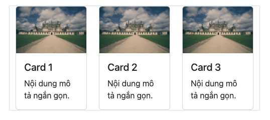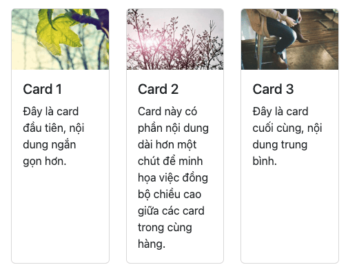 - Kiểm soát độ dài nội dung: Khi các card nằm cạnh nhau, nội dung quá chênh lệch sẽ làm bố cục mất cân đối. Hãy dùng .card-group hoặc cắt ngắn mô tả để giữ chiều cao đồng đều.