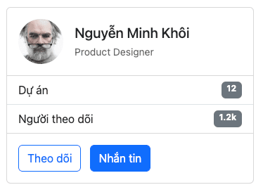 Trong các mạng xã hội, ứng dụng quản trị hoặc hệ thống quản lý người dùng, card thường dùng để hiển thị thông tin cá nhân gọn gàng: avatar, tên, chức danh, số liệu và các nút hành động (“Theo dõi”, “Nhắn tin”). Điểm mạnh là card giúp cá nhân hóa thông tin nhưng vẫn giữ layout đồng bộ cho nhiều người dùng khác nhau.