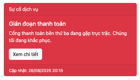 <p class="card-text">Cổng thanh toán bên thứ ba đang gặp trục trặc. Chúng tôi đang khắc phục.</p>